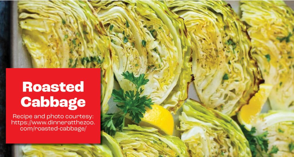 I just tried this recipe from Dinner at the Zoo and WOW — cabbage never tasted so good. You just cut it into wedges, drizzle with olive oil, season with salt, pepper, and garlic powder, roast until caramelized and tender, then finish with lemon juice and fresh parsley. It takes about 30 minutes total (10 min prep + 20 min roasting).